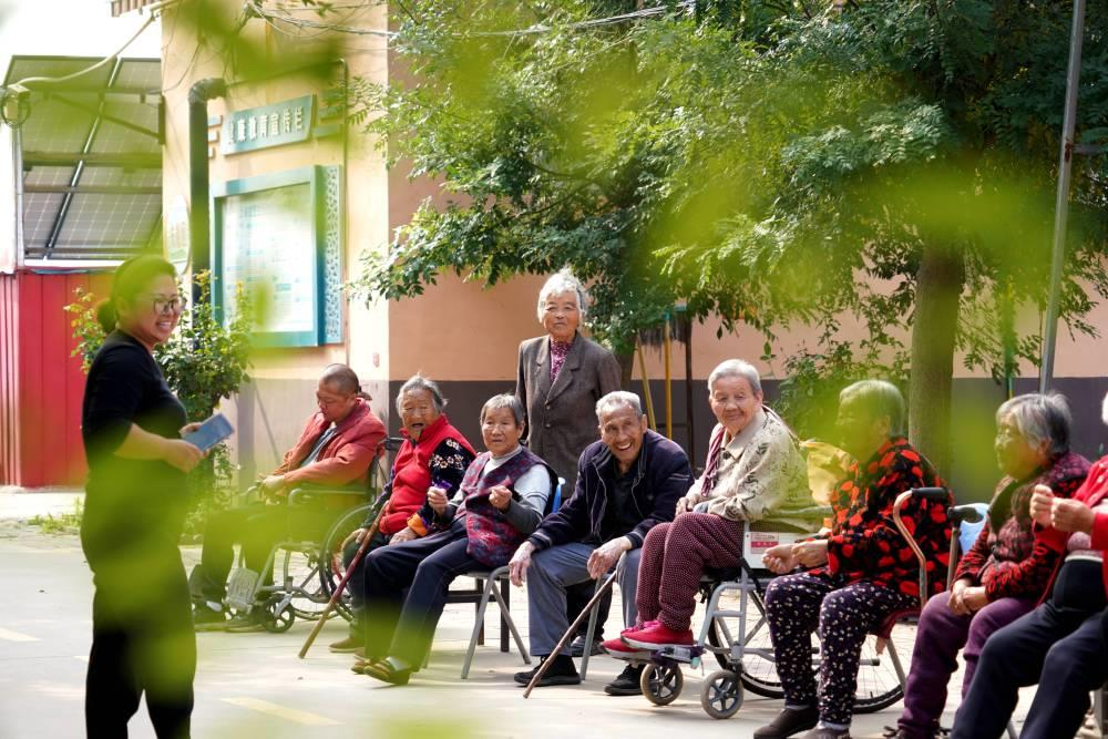 △2024年10月8日,在河北巨鹿縣南大韓村菘樂醫(yī)養(yǎng)中心,工作人員陪同老人散心。