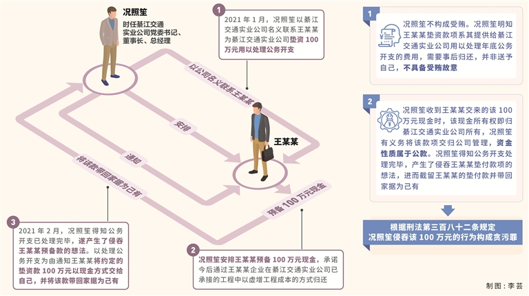 其中,2020年底,況照笙與副總經(jīng)理馬某某商議,安排工作人員唐某從綦江交通實(shí)業(yè)公司發(fā)包的工程中套取工程款用以處理年底公務(wù)開(kāi)支。之后況照笙擔(dān)心唐某套取的資金不夠,于2021年1月以綦江交通實(shí)業(yè)公司名義聯(lián)系與綦江交通實(shí)業(yè)公司有業(yè)務(wù)往來(lái)的私企老板王某某,請(qǐng)其為綦江交通實(shí)業(yè)公司墊資100萬(wàn)元用以處理公務(wù)開(kāi)支,并安排王某某預(yù)備100萬(wàn)元現(xiàn)金,承諾今后通過(guò)王某某企業(yè)在綦江交通實(shí)業(yè)公司已承接的工程中以虛增工程成本的方式歸還。2021年2月,況照笙得知唐某已處理完公務(wù)開(kāi)支,遂產(chǎn)生了侵吞王某某預(yù)備款的想法,便仍以處理公務(wù)開(kāi)支為由通知王某某將約定的墊資款以現(xiàn)金方式交給自己,并將該款帶回家據(jù)為己有。2023年12月,王某某告訴況照笙其墊付的100萬(wàn)元款項(xiàng)尚未歸還,況照笙隨即讓其在承接綦江交通實(shí)業(yè)公司的工程中多開(kāi)100萬(wàn)元成本發(fā)票報(bào)銷(xiāo)。