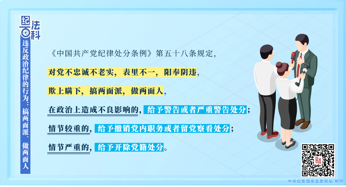 《中國共產(chǎn)黨紀(jì)律處分條例》第五十八條規(guī)定,對黨不忠誠不老實,表里不一,陽奉陰違,欺上瞞下,搞兩面派,做兩面人,在政治上造成不良影響的,給予警告或者嚴(yán)重警告處分;情節(jié)較重的,給予撤銷黨內(nèi)職務(wù)或者留黨察看處分;情節(jié)嚴(yán)重的,給予開除黨籍處分。